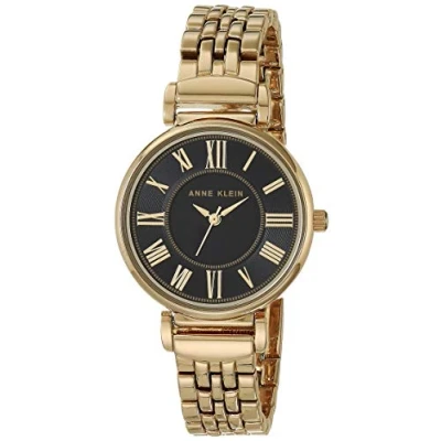 Mineral crystal lens Black dial with gold-tone hands and Roman numerals; printed inner and outer minute track Gold-tone adjustable link bracelet; jewelry clasp and extender Water resistant to 100 feet (30M)