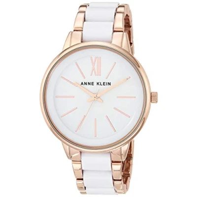 Slightly domed mineral crystal lens; white glossy dial with rose gold-tone hands and markers Rose gold-tone adjustable link bracelet with white resin center links; jewelry clasp and extender Japanese-quartz Movement Case Diameter: 37mm Water resistant to 100 feet (30M)