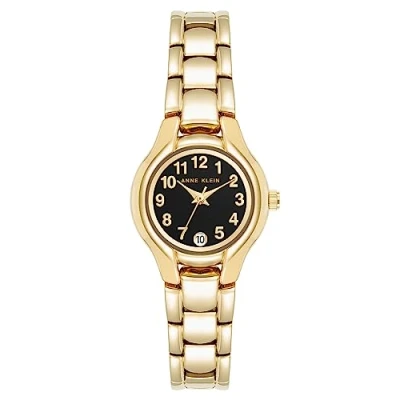 Mineral crystal lens Glossy black dial with date calendar window at 6; gold-tone hands and easy to read Arabic numerals Gold-tone adjustable link bracelet; jewelry clasp and extender Water resistant to 100 feet (30M)