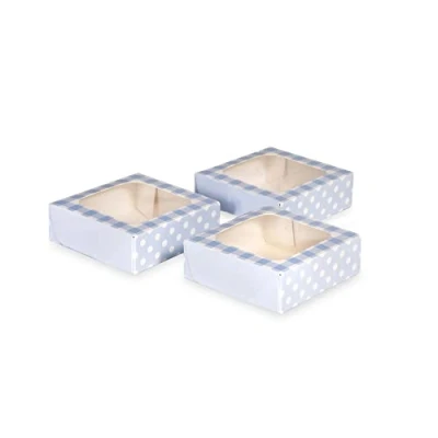 ELEGANT TREAT BOXES WITH WINDOW: These printed paper square treat boxes feature a clear viewing window on top, offering a stylish way to showcase your cakes, cookies, or desserts while keeping them fresh and protected during display or transport. PREMIUM QUALITY MATERIAL: Made from durable, food-safe paperboard for a professional finish. The cupcake boxes' sturdy design ensures your baked goods stay secure, making these boxes perfect for bakeries, catering services, and special events. STRONG AND STABLE DESIGN: Each cookie box includes insert cards to reinforce the base, adding strength and preventing bending or collapse. The cupcake window boxes are ideal for packaging cupcakes, brownies, or mixed treats with confidence and stability. VARIETY OF COLORS AND SIZES: These treat boxes are available in multiple colors and sizes to suit different treats and presentation styles. Perfect for home bakers, professionals, party planners, and caterers seeking stylish and practical packaging. CLEAR DISPLAY WINDOW: The paper treat boxes feature a transparent window on top for a professional presentation, allowing customers or guests to view your baked creations instantly while keeping them securely protected and fresh. EASY POP-UP ASSEMBLY: Delivered flat-packed for space-saving storage. These cake boxes quickly pop into shape without the need for glue, cutting, or folding, making setup fast and effortless for busy bakers and event organizers.