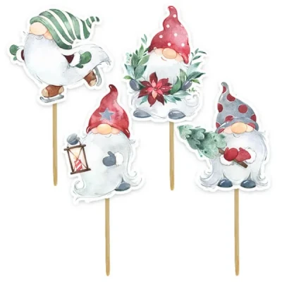 Add a touch of magic to cupcakes, cakes and other festive treats with this set of Anniversary House Christmas Gonk Cupcake Toppers. This delightful set of cake toppers includes four different watercolour illustrations of cheeky festive gnomes. Set contains 12 cupcake toppers - three of each design. These double-sided cupcake toppers have picks made from bamboo and no assembly is required!Approximate dimensions: Christmas Gonk cupcake topper - widths range from 3.5-5cm, Picks - L4.5cm.