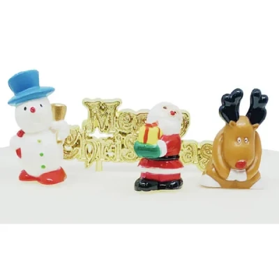 Decorate your Christmas cake in style with this Anniversary House Fun Christmas Character Cake Decorating Kit. Perfect as a standalone display or combined with other cake toppers in the Anniversary House collection, to create your very own unique festive scene.This fun four piece cake decorating set includes a snowman wearing a dandy blue hat, a Father Christmas holding some presents, a cheeky reindeer and a gold coloured Merry Christmas motto cake topper.There's no assembly required, simply press the cake toppers firmly into the cake icing.Each cake topper is washable and reusable, simply clean with a damp cloth and dry completely before storing.
