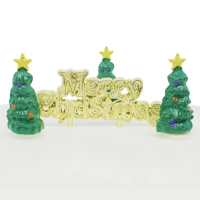 Finish your Christmas cake decorations in style with this Anniversary House Mini Christmas Tree Cake Toppers & Gold Merry Christmas Motto set. Perfect as a standalone display or combined with other cake toppers in the Anniversary House collection, to create your very own unique festive scene.This four piece cake decorating set includes three mini Christmas tree cake toppers decorated with baubles and a gold star plus a gold coloured Merry Christmas motto cake topper.There's no assembly required, simply press the cake topper firmly into the cake icing.Each cake topper is washable and reusable, simply clean with a damp cloth and dry completely before storing.Approximate dimensions: Christmas tree - W3cm x H6.5cm, Merry Christmas motto - W7cm x H4cm.