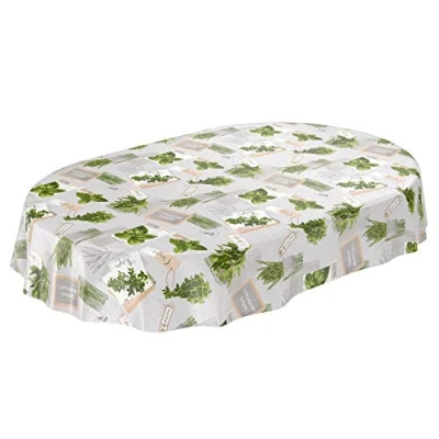 ANRO Oilcloth Tablecloth, Oilcloth, Easy Care, Washable, Herbs, Green, Beige, Organic Basil, Oval, 140 x 220 cm