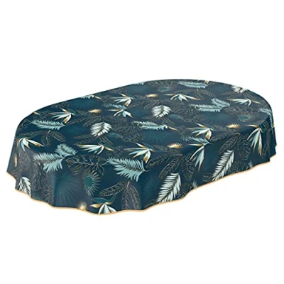 ANRO Oilcloth Tablecloth Washable Garden Round Oval Square Indoor Outdoor Leaves Gold Blue 200 x 140 cm with Hem Edged