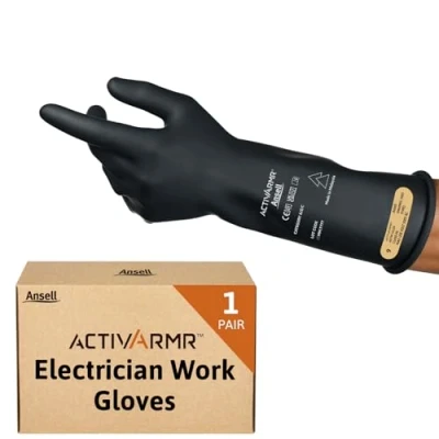 Ansell ActivArmr Electrician Work Gloves, Electrical Protection Class 00 (500V), Insulating Natural Rubber Latex Industrial Safety PPE, 14 Inches, Black, Size M (1 Pair)