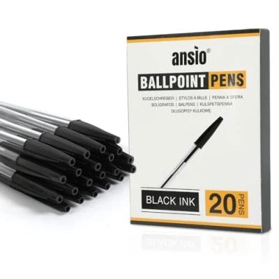 ANSIO Black Biro Pens Medium Tip (1.0mm) Smooth Writing Ballpoint Ideal for School, Office & Home Use: Value Pack of 20