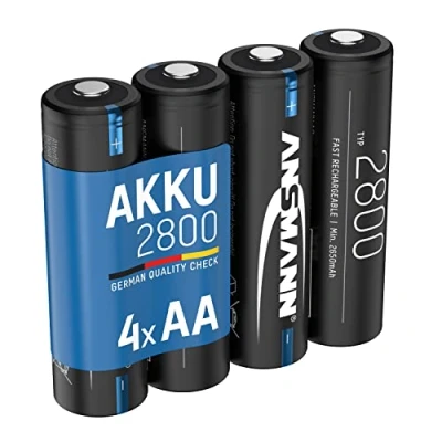 LONG LASTING POWER: This pack of 4 AA type batteries is ideal for devices with high power consumption including digital equipment's, cameras, flash units, speakers, microphones, flashguns - These batteries guarantee long-lasting power HIGH SAFETY STANDARDS: These rechargeable batteries comply with current valid EU directive and meet the highest requirements for safety and longevity with good cycle stability. Heat & cold resistant from -20 ° C to + 65 ° C making them ideal for domestic, industrial and professional use PACK OF 4: This pack consists of 4 x AA Size Mignon NiMH 2800mAh ANSMANN rechargeable batteries. These batteries have been successfully tested for electrical, thermal, geometric and mechanical requirements RECHARGEABLE: These rechargeable batteries can be charged with high charging current resulting in shorter charging time. These batteries also guarantee longer running time all thanks to the high capacity SAVE MONEY: These NiMH batteries can be recharged many times saving you money and reducing waste! These batteries are an economical replacement for disposable / alkaline batteries - These batteries retain 40% charge for up to one year in storage OTHER USES: Use with trackball, Apple mouse keyboard & trackpad, garage door remote controller, flashlight, kids toy, electronic pets, radio controlled car kids, alarm burglar sensors & system, alarm clock, remote control, flash gun, flashgun, Glade auto spray air freshener, Airwick air freshener, diffuser, thermometer, torch, mini sewing machine, travel electric razor, shaver, eyebrow nose & facial trimmer, handheld fan