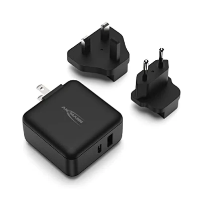 ANSMANN Travel USB Charger 30 W Fast Charge Universal Adapter Plug with 1 x A Port + C and AC Socket Compatible Interchangeable Plugs for USA UK Europe