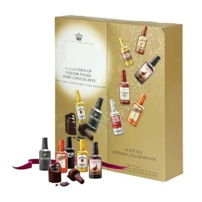 64 Famous Liqueur Miniature Dark Chocolate Bottles filled with 8 premium Liqueurs barnds - The Ultimate Christmas Chocolate Hamper with Topline Christmas Card. Make this holiday season extra special with a Novelty gift that combines the finest dark chocolate and world-renowned liqueurs. Our chocolate bottles are the perfect treat for anyone with a taste for luxury and a touch of indulgence. Our sweets gift box is a treasure trove of indulgence, featuring 64 individually wrapped dark chocolate bottles filled with world-renowned liqueurs. Each chocolate bottle is crafted with premium dark chocolate, creating a rich and velvety exterior that melts in your mouth, revealing the delightful liquid center. Make this Christmas memorable and share the joy of these miniature alcohol bottles gift hamper, beautifully packaged making them an ideal Christmas gifts for stocking fillers, Secret Santa gifts fro women, party bag fillers or as a thoughtful Birthday gifts for mum. This Chocolate Gift is a perfect choice as an addition to your own holiday celebrations and for both men and women who appreciate the finer things in life. Enjoy a selection of different liqueur flavors in a chocolate box, including all encased in decadent smooth, dark chocolate shells that melt in your mouth, providing a unique tasting experience for every palate. Discover your favorites on this sweets gift box or share them with friends and family Our liqueur chocolates come beautifully packaged in an elegant box, making them ready for gifting. No need for wrapping – just add a heartfelt message and watch the smiles light up on Christmas morning!