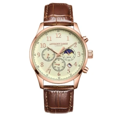 Anthony James Moonphase Wrist Watches Men Stainless Steel Back, Analogue, Leather Strap, Chronograph, Hand Assembled, Water & Scratch Resistant Men's Watch 5 Years Warranty, Rose White