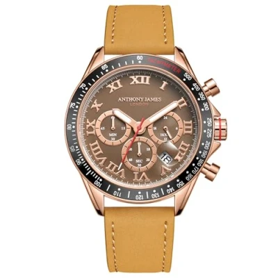 Anthony James Tachymeter Turbo Wrist Watches Men Stainless Steel Back, Analogue, Leather Strap, Hand Assembled, Water & Scratch Resistant Men's Watch 5 Years Warranty, Gold Brown