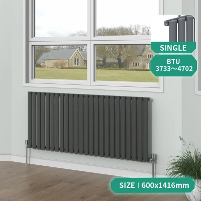 General description Our NRG Anthracite Horizontal Oval Column Designer Radiator offers a contemporary heating solution at a competitive price. With its elegant design, it fits seamlessly into any interior style and easily integrates into your central heating system like a standard household radiator, ensuring a straightforward installation process. Technical specifications Material: 1.5mm premium mild steel Size: 600x1416mm (HxW) Bars: 24 Water inlet/outlet size: 1/2" Triple layered finish tested to exceed 200 hours of neutral acid salt spray testing Tested to BS & EN442 Complies with ISO9001:2008 regulations Compatibility and accessories Compatible with all UK heating systems (tank fed or combi systems) No valves included Other information All radiators come with a manufacturer-leading 15 year guarantee Tested under high hydraulic pressure to ensure impermeability