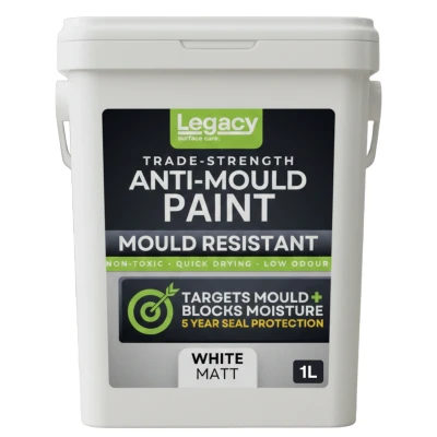 Legacy Anti-Mould Paint is a premium, solvent-free acrylic emulsion formulated to prevent and inhibit mould, mildew and damp-related fungus on interior walls and ceilings. Using an effective fungicidal action, it targets black-spot mould (e.g. Aspergillus niger) and stops spores from germinating — helping restore and protect your surfaces long-term.