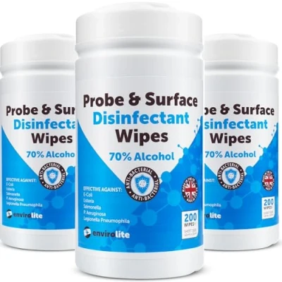 Antibacterial Wipes 3 x Tubs of 200 Alcohol for Cleaning Surfaces and Kitchen Food Probes Disinfectant Sterile Probe Safe