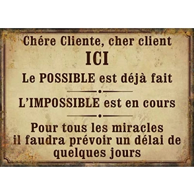 Created in 1995 by M&Mme Comez, Antic Line is the culture, the expression of a common passion for antique furniture (as well as everything related to it) and its stage. From the first year of creation, and to preserve quality, charisma and "lived" will say us, furniture, our designers are surrounded by a team of skilled woodworkers who know how to retain their authenticity in the furniture. Always striving to offer novelties, constantly pursuing "no seen" and exclusive, the couple focuses on an increasingly wide range of decorative items, scents, lamps and textiles. Here we find: Antic Line SEB14027 "Le Possible is Already Made..." 21 x 15 cm Description: Decorative plaque "Dear customer, dear customer, here, the possible is already done, the impossible is in progress, for miracles you will need to allow a few days" by Antic Line, ideal for a vintage decoration with a cosy and retro spirit.