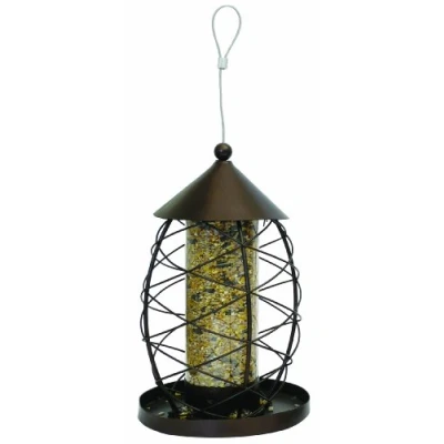 Stylish feeder for all types of seeds and mixes (seed not supplied). Heavy duty metal construction with brushed bronze painted finish. Intergral tray catches loose seed and can be filled with meal worms or table scraps. Easy to fill. Supplied with extra strong hanger.