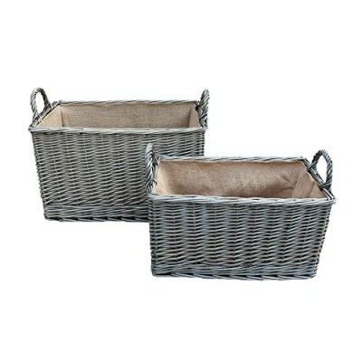 Antique Wash Rectangular Hessian Lined Wicker Log Basket Set of 2