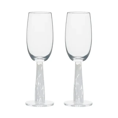 Harts of SturThe Anton Studio Designs Björn Set of 2 Champagne Flutes distinctive hallmark is immediately distinguishable. Characterized by a solitary glass column, broad at its base and narrowing as it ascends, it is adorned with hand-rolled white chips seamlessly integrated into the glass.Perfect for serving champagne and sparkling wine these flutes are contemporary in style with a modern scandi design. Great for gifting as part of the Björn collection, with other matching items sold separately.Each of these Champagne flutes have a 300ml capacity and are suitable for hand washing.Size: 22(H) x 5.5(W) x 5.5(L)cm.
