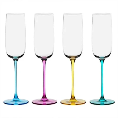 The Anton Studio Designs Set of 4 Gala Champagne Flutes add a colourful flair to your table setting with vibrant hues to pink blue, green and yellow. The multi coloured stems on these champagne flutes are thin and tall for an elegant style, while the bowls are well-rounded.The delicacy of the Gala Champagne Flutes is what makes them truly remarkable and chic. These flutes look great when paired with others from the Gala range and bring a refined yet modern look to your table setting. They also make a lovely sentimental gift for a loved one.Made from 100% GlassHand wash recommendedCapacity: 200ml