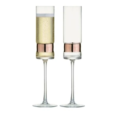 BEAUTIFUL GLASSES TO PAIR WITH A DELICATE DRINK: Love every sip with these two champagne flutes that have been crafted in a simple elegant shape to complement whirling and swirling champagne bubbles! Use these two champagne flutes to share your favourite bottle of the bubbly as the long stem is fashioned for easy holding. The result is a unique set of glassware and a delightful sensory experience best shared with champagne, prosecco and great company HIGH QUALITY CRAFTSMANSHIP: At Anton Studio Designs we believe in high quality glassware which is why our champagne flutes, wine glasses and tumblers have been crafted and finished by mouth blown glass and electroplated. This glass forming technique uses skilled craftsman who handcraft the glass by working molten glass into its decorative final form! What results is a high quality and durable glass craft which fit nicely with the kitchen glass set and display set in the home CLARITY CRYSTAL SET: These champagne glasses are sure to help contain all the sparkle of the champagne whilst adding a flair of elegance to the drink. The glass is made out of a fine delicate process that ensures crystal like clarity of the stem, bowl and base - a beautiful glass masterpiece that has been tempered for durability. They make for a perfect personalised champagne flute set for couples, friends or the home glassware set. Dimensions: L x 50mm, W x 50mm, H x 270mm and volume capacity of 200 ml/ HAND WASH RECOMMENDED A SOPHISTICATED GIFT: This glassware set is a sophisticated, delightful and luxurious gift idea - the set comes gift boxed packaged, so all that remains is the wrapping! Electroplated in shimmering Bronze recess around each bowl, these glasses are a unique gift that will dazzle and surprise friends, wives, parents and your go to party mates! Use these two champagne flute glasses for an intimate celebration with loved ones with anniversary champagne, holiday drinking or for birthday celebrations THE ANTON STUDIO RANGE: If you're in search for high quality glassware for wine, champagne and prosecco then the SoHo range by Anton Studio Designs is for you! The SoHo range is as sophisticated as it is striking! Its clean straight lines run the full length of each glassware piece and are disturbed by an elegant band of bronze, silver or gold. These recessed accents of metallics set the SoHo range apart from any other glassware suite, and create a stunning range of fine glassware