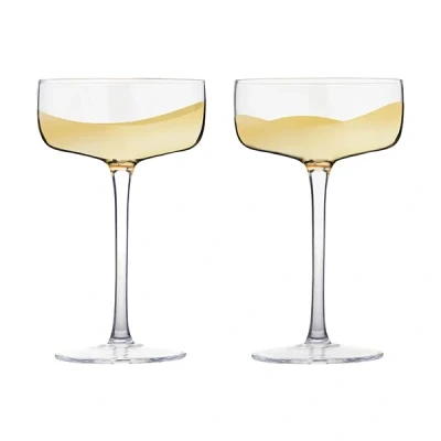 The Anton Studio Designs Wave Set of 2 Champagne Saucers feature a modern design with a flowing gold metallic design. Mouthblown and hand crafted these glasses feature a tall and elegant stem.Softly swirling through the glass, the gold elements gleam with a polished brilliance, creating a reflective, mirrored surface for the design.Ideal for serving celebratory drinks, cocktails and and cheer when entertaining these champagne saucers are great for gifting as part of the Wave collection, with other matching items sold separately.Each of these champagne saucers have a 250ml capacity and are suitable for hand washing.Size: 16.5(H) x 10(W) x 10(L)cm.