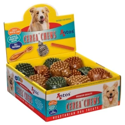 All natural dental dog treats. The edges and contours of the hedgehog shaped treats ensure proper blood flow through the gums & help to prevent the build up of tartar. Made with 6 types of human grade natural vegetables. No added chemicals, wheat, gluten or meat by-products. Available in the all natural colors of green, orange and brown.