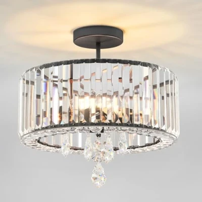 ANWIO Black Chandeliers Ceiling Light 3 Crystal Lights,Light Fittings Ceilings,Semi Flush Mount Chandelier for Living Room Hallway Dining Kitchen,Dia 36.5cm,(E27 Base)