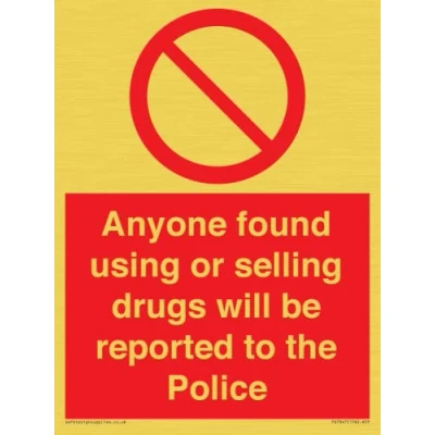 P001 : General Prohibition This sign is made from vinyl gold sticker Gold metal effect sticker for flat, clean surfaces. Not for rough, plastic, or dusty surfaces. A5 portrait Sign Text: Anyone found using or selling drugs will be reported to the Police