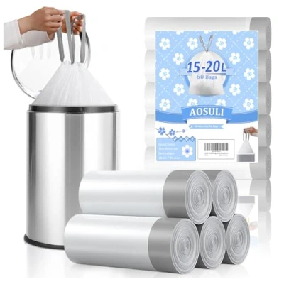 AOSULI 15L 20L Bin Bags White Waste Paper Liners Pedal Tie Handles Drawstring Garbage Small Rubbish for Bthroom,Kitchen,Office,60Counts