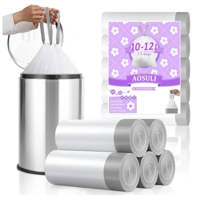 AOSULI Pedal Bin Liners 10L 12L Bags Small Rubbish Tie Handles Trash 75 Counts White Plastic Drawstring Garbage for Bathroom,Toilet,Office,Bedroom,fit 7L,8L,9L,15L Waste