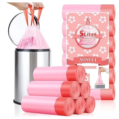Small Bin Bags for Bathroom Size:Ours 5l bin liners with a size of 40x45cm,suitable for daily household use Drawstring Design:Ours tie handles bin bags allows you to easily close and lift the waste bag without touching it Non Leakage:Ours waste paper bin liners has a high load and tensile force,and will not easily crack or leak Safe Use:Small garbage bags 5l are made of safe and harmless materials to ensure the safety of garbage bags Widely Used:Small rubbish bags with handle can easily clean up household garbage,such as food debris,bathroom,toilet paper,bottles