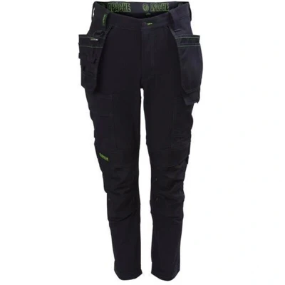 General description These Apache Calgary Black Stretch Holster Trousers for Men are designed for durability and comfort, making them ideal for all-day wear. They are constructed from a blend of 92% nylon and 8% elastane, providing four-way stretch, shape retention, abrasion resistance, and water repellency. The trousers are reinforced with Cordura on the knee pads, holster pockets, and hem for enhanced durability. They feature multiple pockets for convenient storage, including a side cargo pocket, two holster pockets, a secure side pocket for a mobile device, and inset rear pockets to prevent fabric bellowing. Technical specifications Material: 92% nylon, 8% elastane Material weight: 260 GSM Waist size: 42 inches Leg length: 31 inches Compatibility and accessories These trousers are designed for professional use in construction, maintenance, and DIY projects. They are compatible with various work accessories and tools that fit into the pockets and holsters. Installation Adjust the