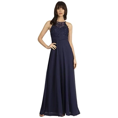 Narrow A-line, made of lace and slightly grained chiffon American neckline, narrow cut-out in the back Built-in cups With lining Hook and zip back fastening