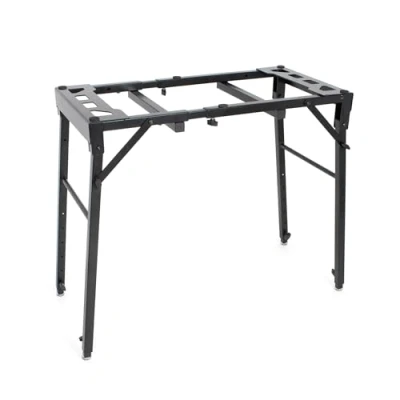 Adaptable and strong table stand for keyboards Width adjustable to accomodate keyboards, mixing desks, DJ controllers and more Height adjustable between 71 and 94 cm Locking pins and knobs allow for easy adjustment Ball joint feel for stability on slightly uneven surfaces