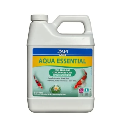Contains one (1) API POND AQUA ESSENTIAL Pond Water Conditioner 976ml Bottle WORKS INSTANTLY: Highly concentrated pond treatment works instantly to remove harmful chemicals, making tap water safe for fish; Reduces the risk of fish loss when starting or maintaining a pond DECHLORINATOR: Removes chlorine, chloramines, heavy metals which are found in tap water and can cause gill and tissue damage, breathing difficulty, stress and fish death AMMONIA REMOVER: Removes the toxic ammonia continually released by fish through their gills, urine and solid waste. Uneaten food and decaying organic matter also add ammonia. Small amounts of ammonia stress fish; large amounts of ammonia will kill fish NITRITES AND NITRATES REMOVER: Produced by fish waste and uneaten fish food, nitrites inhibit respiration and suppress the immune system at low levels, while high levels cause suffocation; Nitrates can be harmful to fish and lead to algae growth