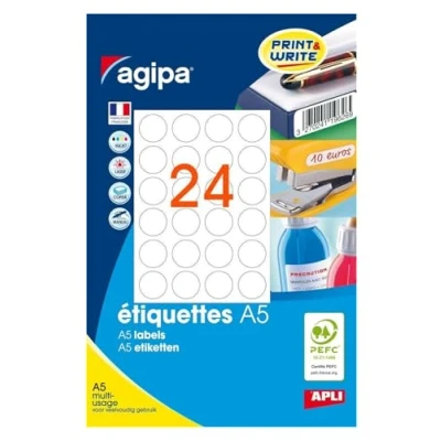 Multi-purpose white dots ø 30 mm. Pack of 16 sheets A5 multi-purpose (384 tabs). Permanent adhesive. For many uses: identify, price tags, markings, etc. These labels are ideal for easy printing but also for handwriting. APLI-AGIPA adhesive labels compatible with the various inkjet, laser and copier printers on the market: Epson Canon HP Lexmark. No risk of jamming due to the high temperature resistant adhesive.