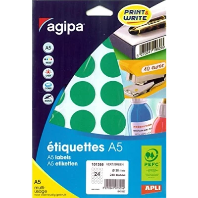 Green multi-purpose pellets Ø 30 mm. Pack of 10 A5 multi-purpose sheets or 240 tablets. Permanent adhesive. For multiple uses: identify, mark price, report etc. These labels are an ideal product for easy printing but also for manual writing. APLI-Agipa adhesive labels compatible with various inkjet printers, laser and copiers on the market: Epson, Canon, HP, Lexmark, etc. No risk of jamming due to high temperature adhesive