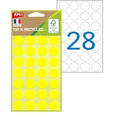 Pack of 168 yellow coloured dots with permanent adhesive. Diameter: 15 mm. Recycled labels made from 100% recycled FSC certified paper. 100% non-polluting water-based acrylic adhesive. 100% recyclable film. Round coloured dots for marking documents, schedules, inventory, products or craft projects Hand writing.