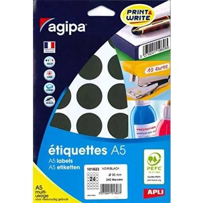 Multi-purpose black dots, diameter 30 mm. Pack of 10 A5 multi-purpose sheets - 240 tablets. Permanent adhesive. For a wide range of uses: identifying, marking prices, signalling, etc. These labels are an ideal product for easy printing but also for handwriting. Apli-agipa adhesive labels compatible with different inkjet printers, laser printers and copiers on the market: Epson, Canon, Hp, Lexmark. No risk of jamming thanks to the high temperature adhesive Certification: PEFC