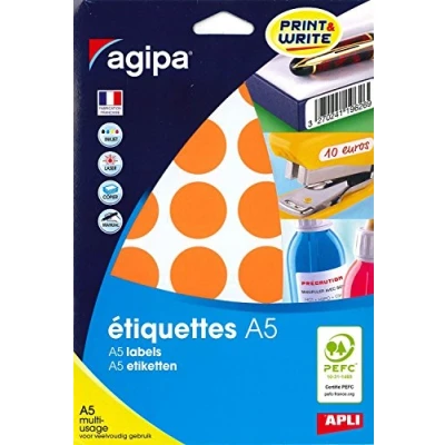 Multi-purpose orange pellets Ø 30 mm. Pack of 10 A5 multi-purpose sheets or 240 tablets. Permanent adhesive. For multiple uses: identify, mark price, report etc. These labels are an ideal product for easy printing but also for manual writing. APLI-Agipa adhesive labels compatible with various inkjet printers, laser and copiers on the market: Epson, Canon, HP, Lexmark, etc. No risk of jamming due to high temperature adhesive