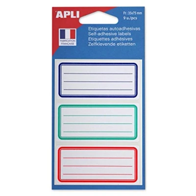 School labels lines and frame blue, red, green permanent adhesive 35x75 mm. Pack of 9 tags. For books and notebooks.