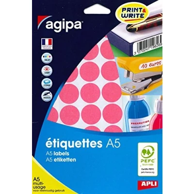 Multi-purpose pink tablets Ø 24 mm. Pack of 10 A5 multi-purpose sheets - 400 tablets Permanent adhesive. PEFC For multiple uses: identify, mark price, report etc. These labels are an ideal product for easy printing but also for manual writing. APLI-Agipa adhesive labels compatible with various inkjet printers, laser and copiers on the market: Epson, Canon, HP, Lexmark, etc. No risk of jamming due to high temperature adhesive