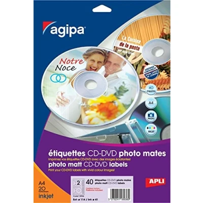 PHOTO PACK OF 40 cd/dvd labels pack of 20 sheets A4 Photo mat Permanently adhesive. Outer Diameter 117,5 mm and 18 mm internal diameter.
