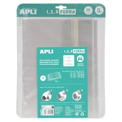 75 micron clear polypropylene sleeves size 280 x 530 mm (H x W) with self-regulating tab. Ideal for lining and protecting books. The best material quality/price ratio. Each pack contains 5 pieces to quickly insert 5 books: put the book inserts in the flaps, close the book to tighten the cover, and attach it by removing the protective tape. The easiest way to wrap books, notebooks and folders as they fit any width without the need to cut or use tape. Highly recommended for school. To find out which size to choose, measure your book high. All APLI 1, 2, 3 Forra covers fit books 21 inches wide (please measure open book end to end to check this). Product complies with the REACH regulation on the manufacture, placing on the market and the use of chemical substances and mixtures in products. Phthalate free, non-toxic.