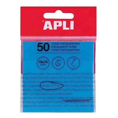 APLI 19571 Transparent Sticky Notes 75 x mm Colour: Blue 50 Translucent Sheets Waterproof Ideal for Students and Teachers.