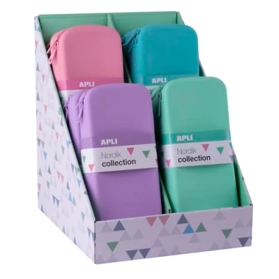 Display box with 8 rectangular flat Nordik coloured pencil cases with double zip. Each display has 2 cases pink, 2 purple, 2 turquoise green and 2 blue. Each case is rectangular and flat and measures 225 x 105 x 45 mm. The material of the cases is high quality silicone. It is very durable, skin-friendly, easy to clean and waterproof. Functional cases: spacious, double zip, flexible, handy and durable. Vérsatiles cases: ideal for taking to school, to use as a toiletry bag, or to protect any belongings.