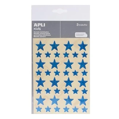 Bag stickers with star motif of two different sizes (12.5 mm and 19.5 mm) in blue holographic Each pack contains 3 sheets, total 120 stickers per bag Playing and creating with stickers is a basic activity that allows the development of fine psychomotor skills The geometrics help to work different skills and skills such as getting to know colours, shapes and sizes; developing logic and creativity Apli stickers meet the highest standards of quality and safety