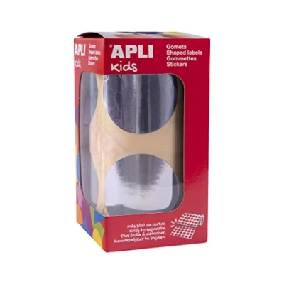 APLI Kids 18484 Roll of 354 Round Gummies Ø45 mm Metallic Silver, Permanent Adhesive