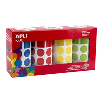 APLI Kids 18804 Pack of 8260 Gummies in 4 Rolls (Blue, Red, Yellow and Green) with Assorted Geometric Shapes (Circle, Square, Rectangle, Triangle) 20mm Permanent Adhesive